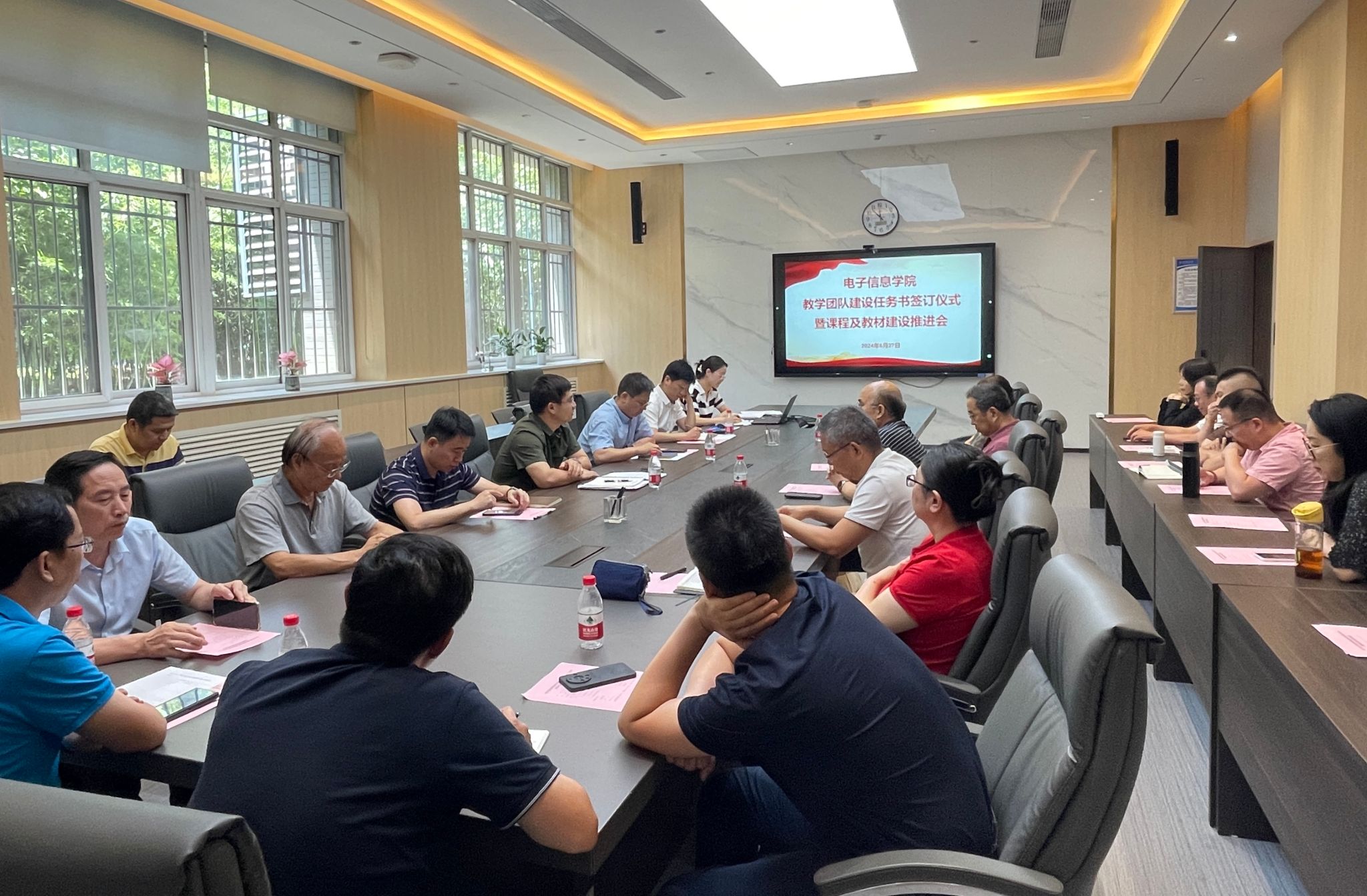 本科教学团队建设任务书签订仪式暨课程及教材建设研讨会在119会议室召开。学院党委书记侯俊、院长张洵颖、副院长姚如贵、副院长高永胜、各教学团队负责人、课程及教材建设负责人参加会议。会议由高永胜主持。